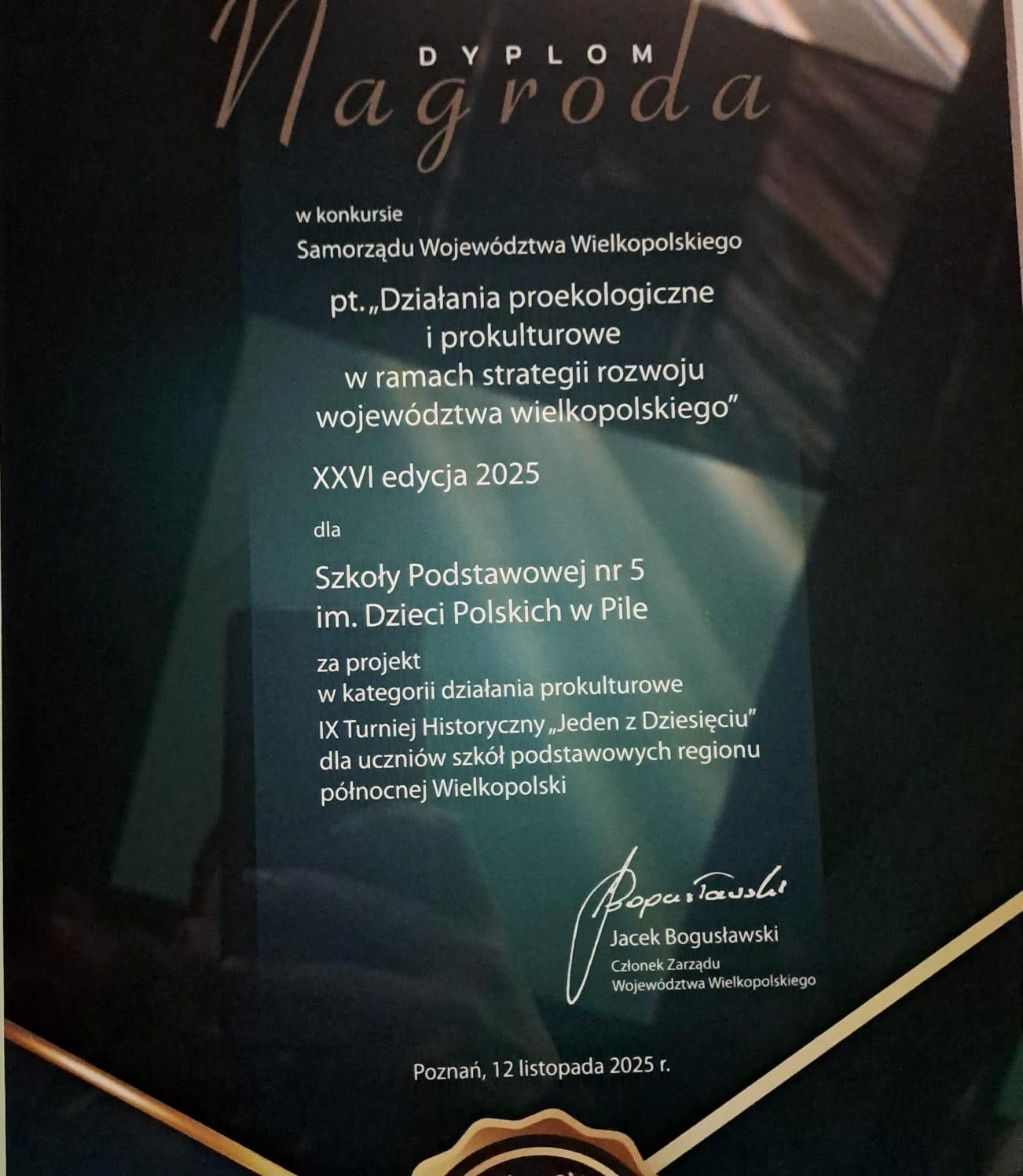 Niewątpliwym sukcesem Szkoły Podstawowej nr 5 im. Dzieci Polskich w Pile jest wyróżnienie w konkursie Samorządu Województwa Wielkopolskiego za projekt w kategorii działania prokulturowe – IX Turniej Historyczny „Jeden z dziesięciu” dla uczniów szkół podstawowych regionu północnej Wielkopolski.